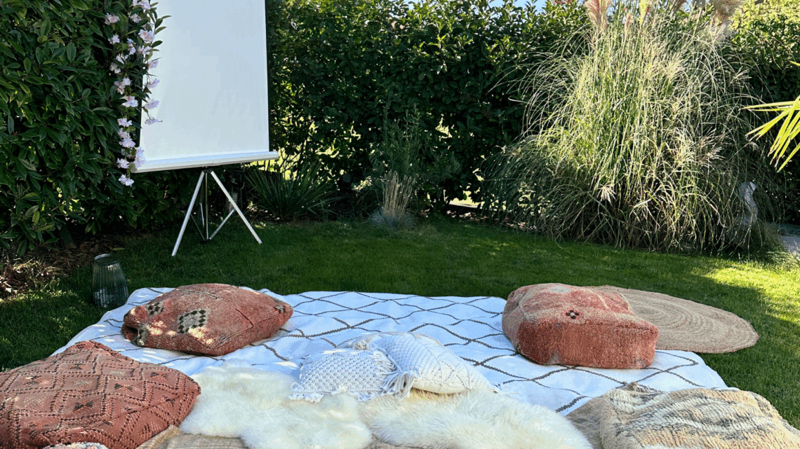 Formule Cinéma Chic – nous installons l’ensemble du décor : écran, projecteur, tapis, coussins, couvertures, tables basses, guirlandes lumineuses, et accessoires déco assortis.